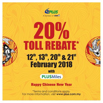 plusline1800880000 Tweeted: 1006hrs Nikmati rebat tol sempena Tahun Baharu Cina pada 12, 13, 20 & 21 Februari 2018! Tertakluk kepada terma dan syarat. Untuk keterangan lanjut klik pautan ini #TahunBaharuCina